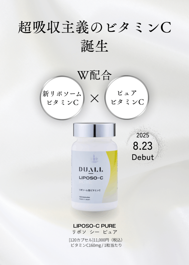 DUALLシリーズ第一弾として、ご好評をいただいていたLIPOSO-C in ROSEに替わり、「PURE」(ピュア)を発売いたします。